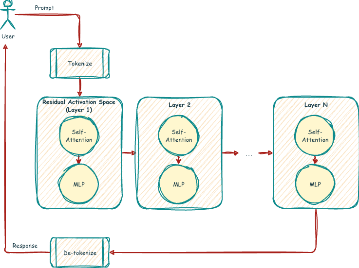 Beneath many LLMs is a type of neural network architecture called a transformer. Transformers don't directly process the text you write but instead break it into small pieces called tokens. Each token is mapped to a mathematical representation called a vector using an embedded table along with extra information about its position in the sequence. As tokens pass through the model's layers, each maintains a residual stream that operates effectively as a running internal state that accumulates updates from attention and feed-forward components. A mechanism called self-attention lets tokens look at and learn from other tokens in the sequence, providing context, while the multi-layer perceptron (MLP) applies learned nonlinear transformations independently to each token, expanding and refining features that the model can use to predict the next token.1